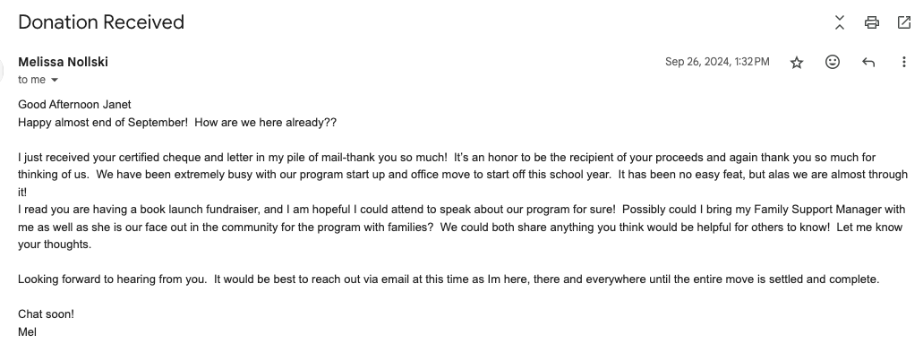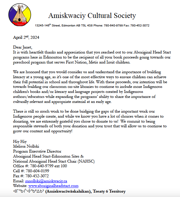 Author Contribution to Aboriginal Head Start – Edmonton Sites by Janet Hamilton | Nov 3, 2024 | Working on | 0 comments See Below for Letter of Understanding from Melissa Nollski, Executive Director AHS Submit a Comment Cancel replyYour email address will not be published. Required fields are marked *Comment * Name * Email * Website Save my name, email, and website in this browser for the next time I comment.